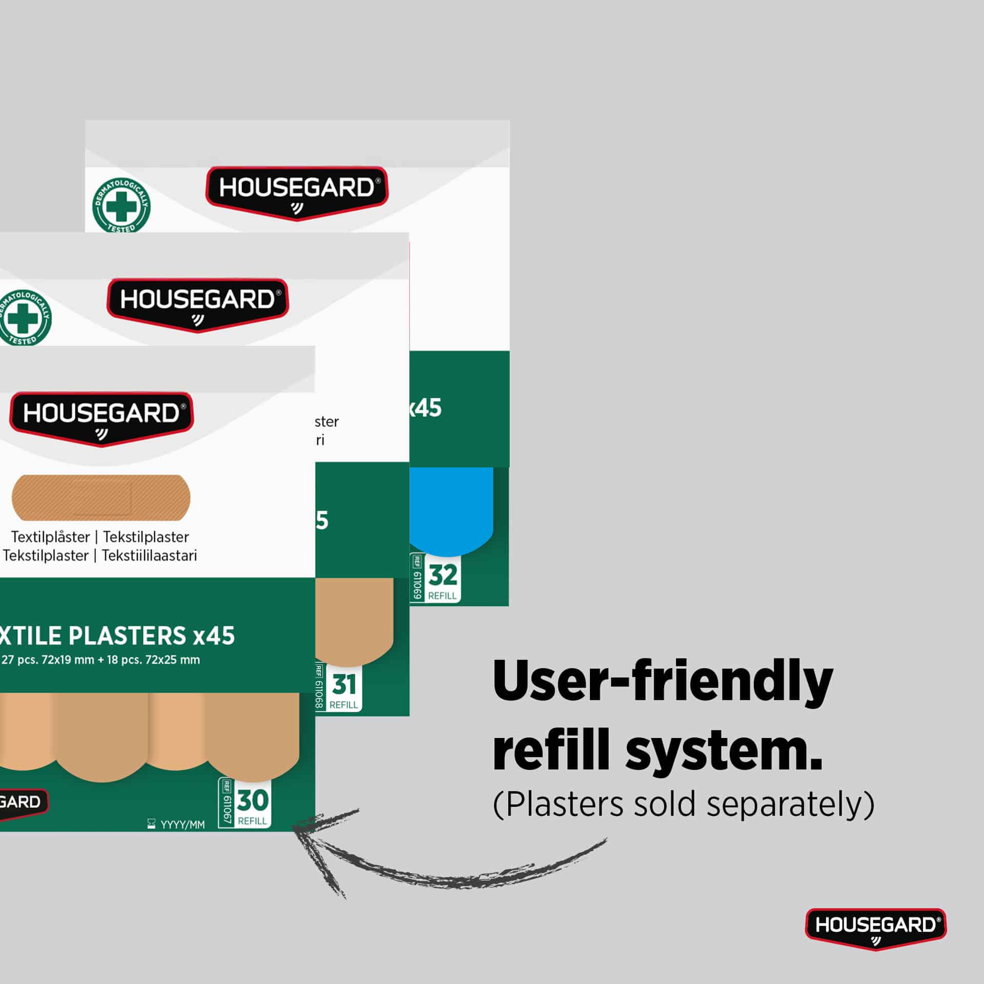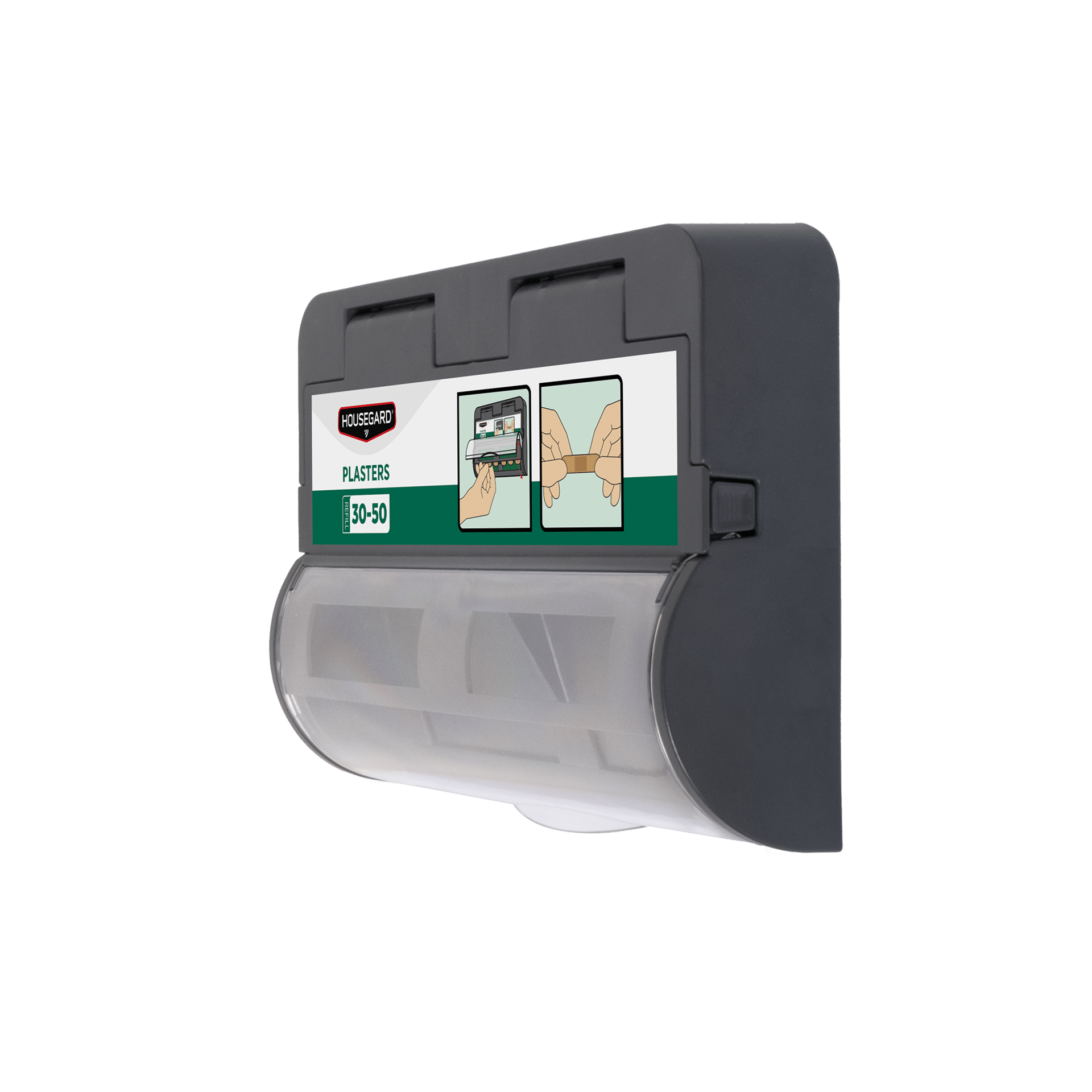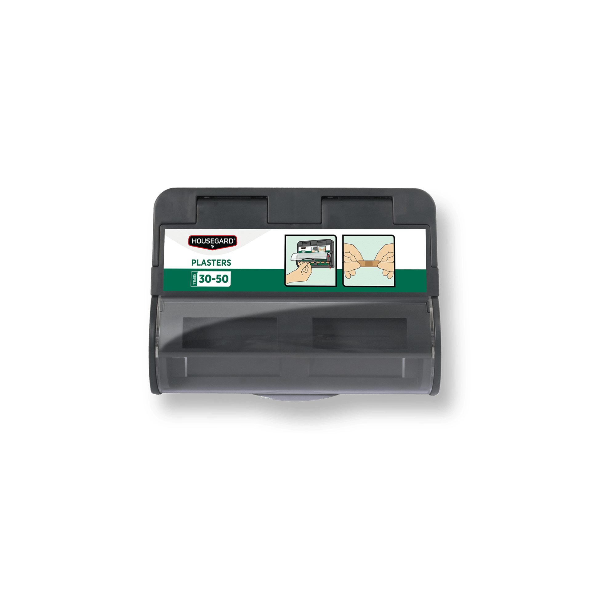 Täyttö tehdään avaamalla etupaneeli ja asettamalla refillit paikoilleen. Käytön aikana laastarit ovat helposti otettavissa alaspäin suuntautuvan aukon kautta. Asiakas valitsee Housegardin laastarirefilleistä sopivimmat, kuten tekstiili-, vedenkestävät, näkyvät tai jäljitettävät vaihtoehdot.