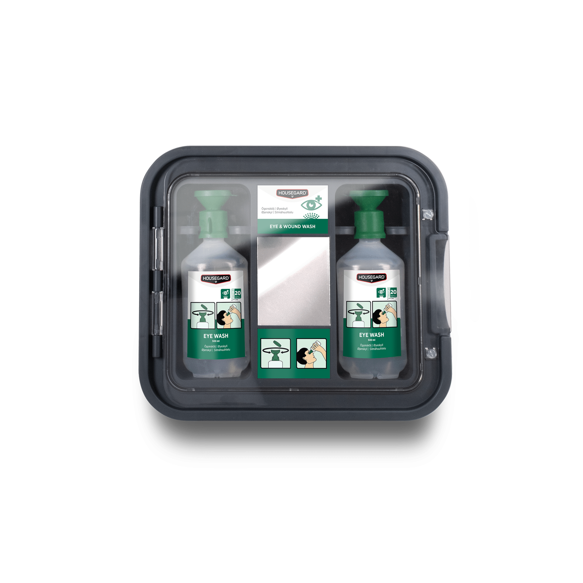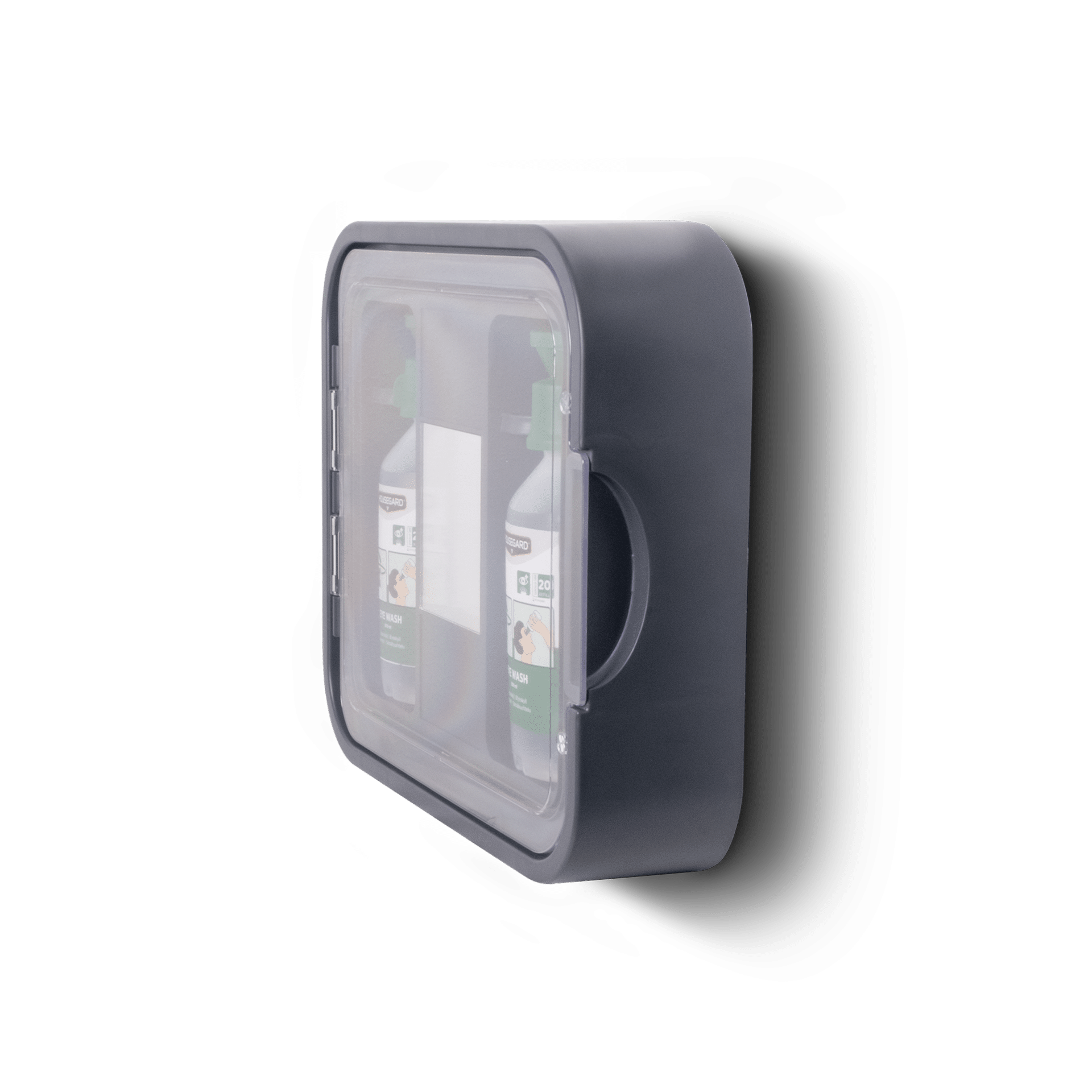 Asema on sijoitettu kestävään suojakaappiin, jossa on läpinäkyvä luukku, jotta pullot ovat puhtaina, näkyvillä ja helposti saatavilla. Kaapin peili auttaa kohdistamaan huuhtelun oikein, mikä on erityisen hyödyllistä kiiretilanteissa tai autettaessa toista henkilöä.