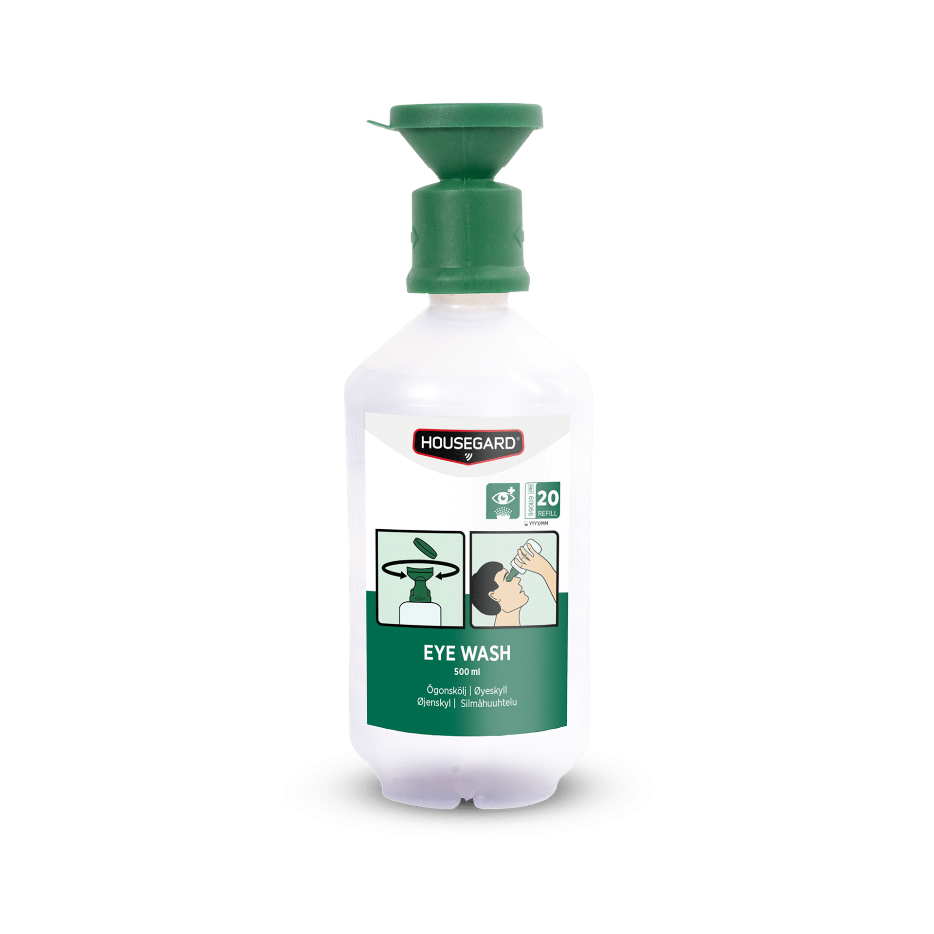 Silmähuuhtelupullo 500 ml sisältää steriiliä keittosuolaliuosta (NaCl 0,9 %), joka on tarkoitettu runsaaseen silmän huuhteluun pölyn, lian, lastujen ja muiden ärsyttävien aineiden poistamiseksi. 500 ml:n pullo on suunniteltu täyttöpakkaukseksi ja lisävaraksi erityisesti ympäristöihin, joissa silmävahinkojen riski on toistuva ja huuhtelua saatetaan tarvita pidempään.
