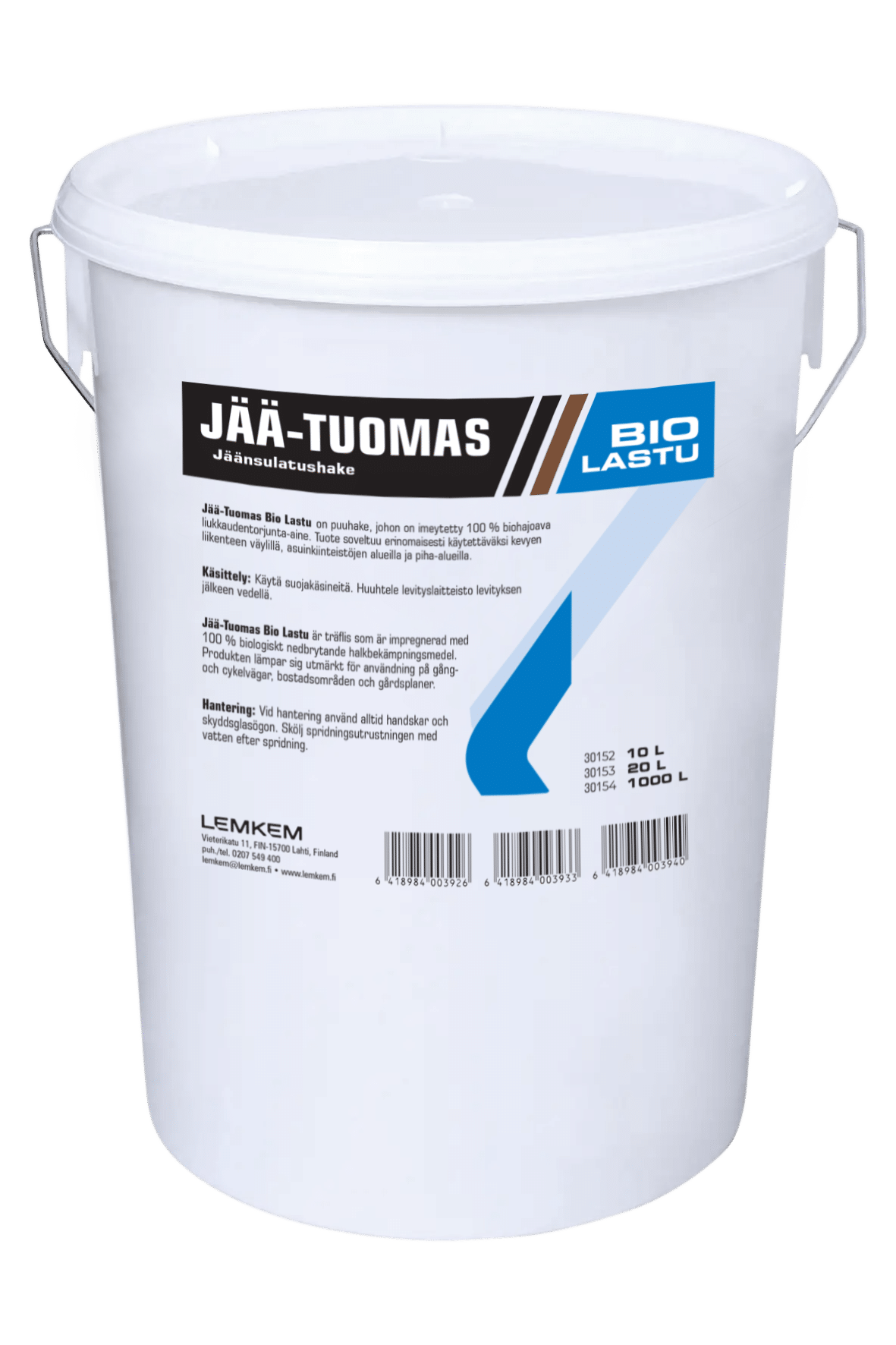 Jää-Tuomas BIO Lastu on aivan uudentyyppinen tuote liukkaudentorjuntaan kiinteistöjen piha-alueilla ja kevyenliikenteenväylillä. Jää-Tuomas BIO Lastu sisältää 100 % biohajoavaa jäänsulatusainetta puulastuihin imeytettynä. Tämä patentoitu ratkaisu vähentää tehokkaasti liukkautta ja on hellävarainen sekä pinnoille että materiaaleille.